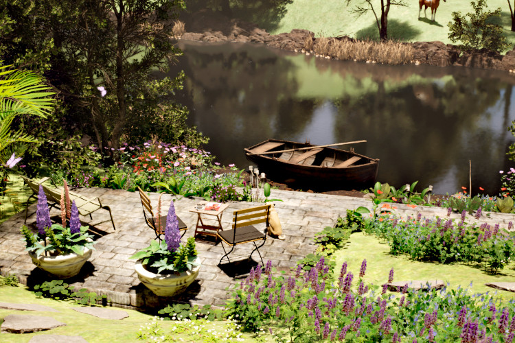This multi-level garden was created on a riverbank slope. Created as a lifestyle garden to reflect mid life pre-retirement aspirations in a rural riverside setting.